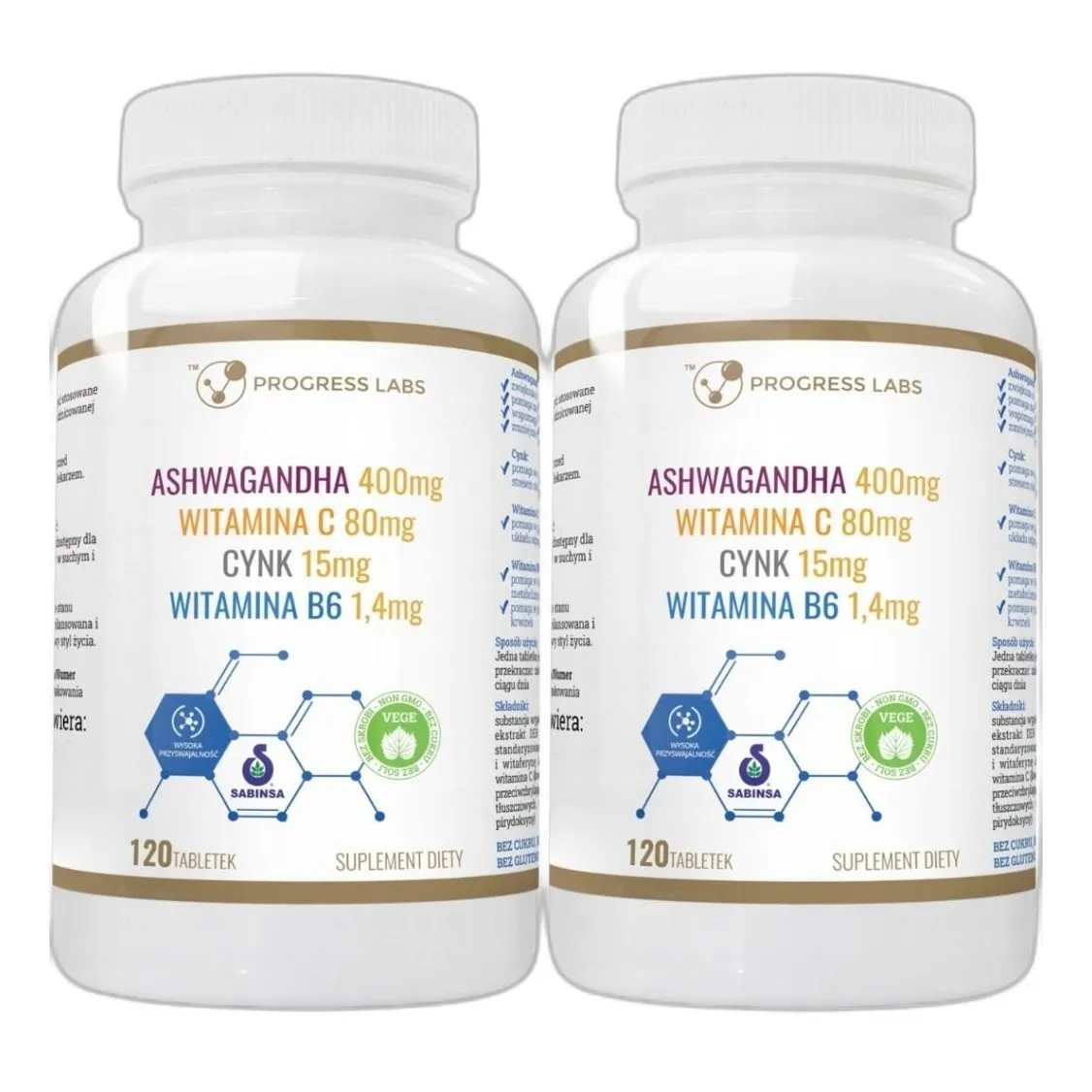 ASHWAGANDHA + CYNK + WITAMINA C + B6 1+1 GRATIS Stres Odporność 2 x 120 tab — odczynnik chemiczny.