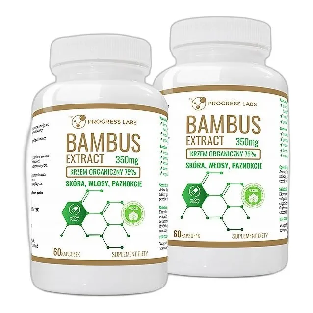- Suplement Bambus 350mg 75% Krzemu Organicznego Skóra Włosy zawiera ekstrakt z bambusa, który jest bogaty w krzem organiczny. Jest to składnik wspierający zdrowie skóry, włosów i paznokci.